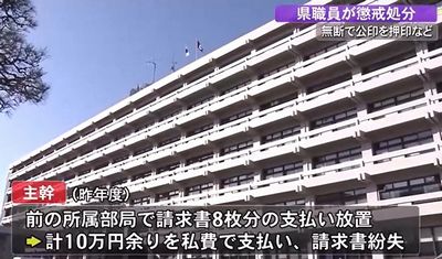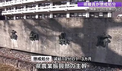 高知県は8月27日、上司の決裁を受けず、公印を無断で使用して公文書を作成するなど、不適切な事務をした農業振興部の主幹職員を減給10%3カ月の懲戒処分。