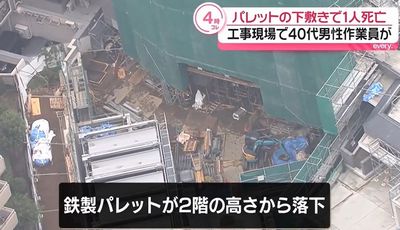 警察によると、現場ではマンションに併設される機械式立体駐車場の工事が行われていて、駐車場の床として使われる鉄製のパレット(数百kg)が何らかの理由で2階から1階へ落下し、40代の作業員が挟まれたという。
