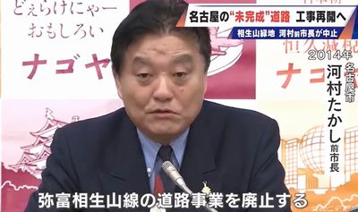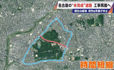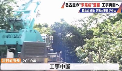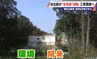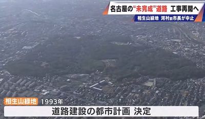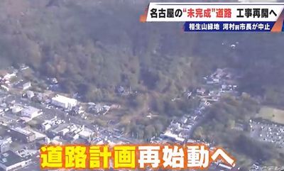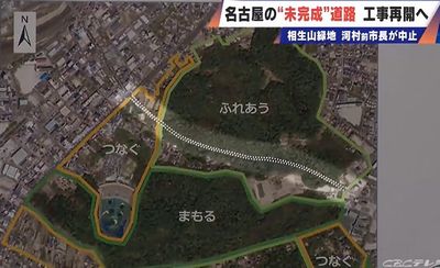 住宅街の真ん中にある相生山緑地には、1993年に道路建設が都市計画決定されました。しかし、「現地に群生するヒメボタルなど貴重な自然を守るべき」という市民団体の声が高まり、河村前市長が2010年に工事を中断。その後、学術検証委員会や市民アンケートなどを経て、2014年に正式に中止を発表した。