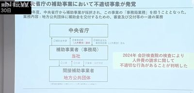 検査院によると、同社は2019~23年度、経済産業省や国土交通省など8府省庁の計83事業で、委託費や補助金計212億1千万円を受給した。主なものは、原発立地地域で新産業の創出などを目指す経済支援や、コロナ禍後のインバウンド回復に向けた事業の事務局業務などだった。