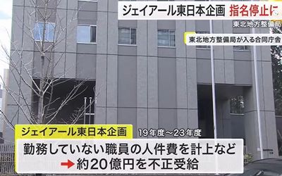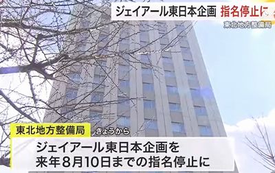 国の委託費や補助金など約20億円を不正に受給した問題を受け、東北地方整備局はジェイアール東日本企画を9カ月間の指名停止とした。