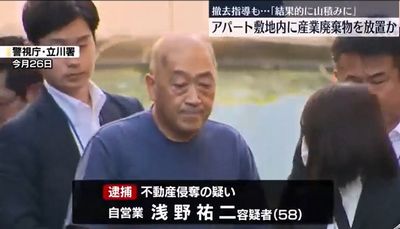 警視庁によると、浅野祐二容疑者は2025年7月から10月ごろにかけて、東京・立川市にある都営アパートの敷地内に産業廃棄物やがれきなどを運び入れて放置することで、東京都が所有する土地を違法に占拠した疑いがもたれている。