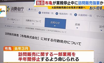 違法な訪問販売で2024年、業務停止を命じられた「布亀の救急箱」で知られる「布亀」で働いていた女性が「停止期間中も訪問販売を続けるよう強いられた」として、提訴することが分かった。