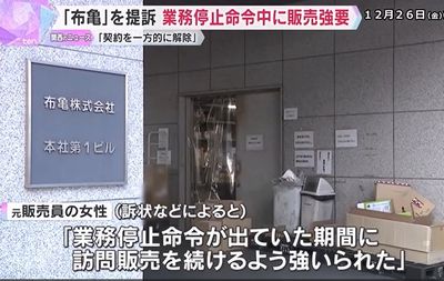 2025年12月26日、救急箱で知られる「布亀」で働いていた女性が、業務停止命令が出ていたにもかかわらず訪問販売を続けるよう強いられたとして、損害賠償を求める訴えを起こした。