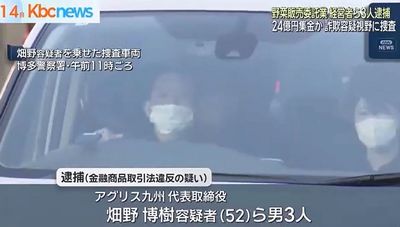 捜査関係者によると、熊本県の農産物販売会社「アグリス九州」の代表取締役、畑野博樹容疑者(52)ら男3人は、2021年12月から2022年6月に、9人に対しキャベツなど野菜の販売委託事業への出資を勧誘し、無登録で金融商品取引業を行った疑い。