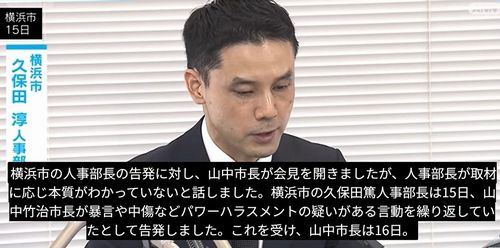 横浜市の久保田淳人事部長(49)は1月15日、山中竹春市長(53)が暴言や中傷などパワーハラスメントの疑いがある言動を繰り返していたとして告発しました。