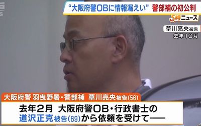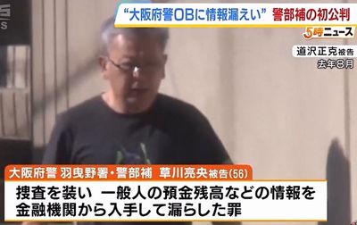 捜査と偽って入手した情報を大阪府警OBに漏らしたなどとして、地方公務員法(守秘義務)違反などの罪に問われた府警の警部補、草川亮央被告(56)の初公判が2月2日、大阪地裁(伊藤寛樹裁判長)で開かれ、草川被告は罪状認否で「間違いありません」と起訴内容を認めた。