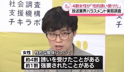 3月3日の夕方、5時半以降の全国ニュースで放送業界の女性の4割が「性的からかいを受けた」という調査機関の調査結果が発表された。