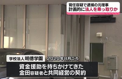 偽造された議事録では、コンサルティング会社から約1000万円の借り入れのほか金田容疑者が運営する別の法人の借金を肩代わりさせるために「明徳学園」が所有する不動産に抵当権を設定することなどが承認されていた。借り入れと借金の総額はおよそ4200万円。返済が滞ったことにより不動産は競売にかけられ第3者が所有。