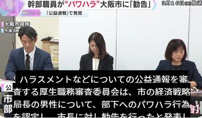 外部弁護士らで構成する大阪市公正職務審査委員会は3月16日、部下の職員を大声で叱責するなどしたとして、市経済戦略局の岡本圭司局長(68)の言動計26件をパワーハラスメントと認定し、言動を改めるよう勧告したと発表。岡本氏は調査に対し、パワハラを否定。