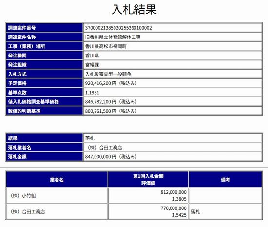 県は「旧香川県立体育館解体工事」を総合評価一般入札した結果、8億4700万円(税込み、以下同)で同社に決めた。