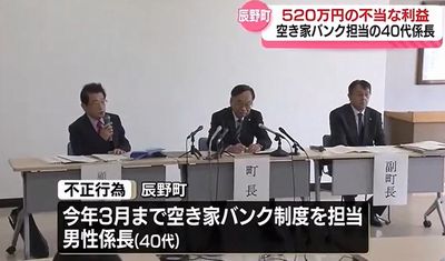 2025年8月、町に「辰野町の空き家バンクの登録が減った」などと情報提供があり、不正が発覚。顧問弁護士の聞き取りに対し、係長は事実を認め、「生活が乱れていた」と話したという。町は今後、係長を懲戒免職処分とする方針で、刑事告訴と刑事告発も行うとしている。