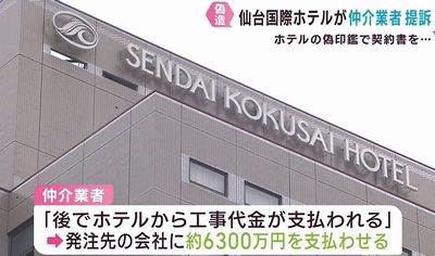 関係者によるとこの業者は、別の工事を巡ってホテルの印鑑を偽造したうえ偽の契約書を作成、市内青葉区のデザイン会社と工事の契約を結び、デザイン会社には「後でホテルから工事代金が支払われる」などと説明し、着手金として約6300万円を支払わせていた。