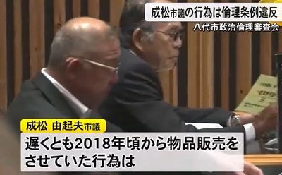報告書によると成松市議が中学校運動部の活動費と称して八代市役所内で市幹部職員に遅くとも2018年頃から約20年間、中学校の部活動費として市幹部に物品を販売させていた行為は地位や肩書を利用したもので市政治倫理条例に違反するとしている。
