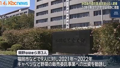 捜査関係者によると、熊本県の農産物販売会社「アグリス九州」の代表取締役、畑野博樹容疑者(52)ら男3人は、2021年12月から2022年6月に、9人に対しキャベツなど野菜の販売委託事業への出資を勧誘し、無登録で金融商品取引業を行った疑い。