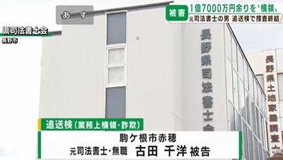 捜査関係者によると、男は元司法書士の古田千洋被告。2025年3月、駒ケ根署に自首し、同10月以降、計約1億1800万円を着服したとする業務上横領の疑いで逮捕、起訴された。2026年1月に開かれた初公判で、古田被告は「間違いありません」と起訴内容を認めている。