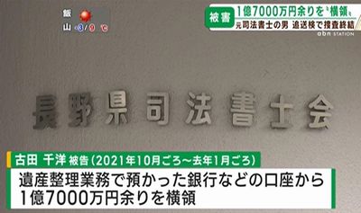 長野県警は3月16日までに、司法書士として依頼人から預かった現金を着服する行為を繰り返したとして、3件の業務上横領と詐欺の疑いで、同県駒ケ根市赤穂の無職の男(40)=別の業務上横領の罪で公判中=を追送検したと発表した。追送検容疑の一部は起訴済みで、県警は依頼人から着服、詐取した金額の合計は約1億7千万円に上るとみている。