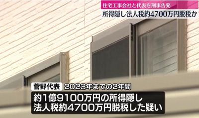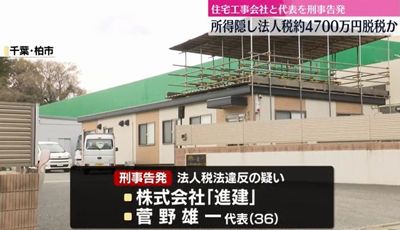 法人税約4700万円を脱税したとして、東京国税局が外構工事業「進建」(千葉県柏市)と同社の菅野雄一代表取締役(36)を法人税法違反容疑で千葉地検に告発していた。