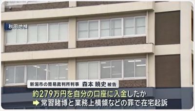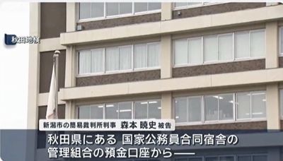 起訴状などによると、森本判事は2023年4月7日~25年5月1日、住んでいた秋田県横手市の国家公務員宿舎の管理組合で居住者から集めた共益費のうち、現金計278万5200円を自分名義の預金口座に入金するなどして横領した。