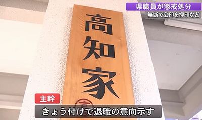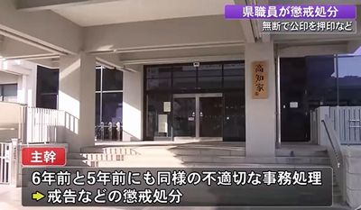 高知県は8月27日、上司の決裁を受けず、公印を無断で使用して公文書を作成するなど、不適切な事務をした農業振興部の主幹職員を減給10%3カ月の懲戒処分。