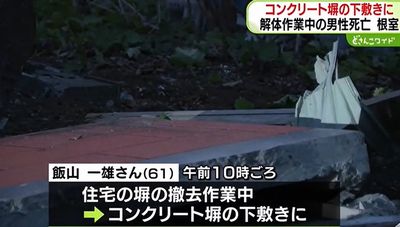 10月16日午前、北海道根室市の解体作業現場で、60代の男性が倒れた塀の下敷きになり、搬送先の病院で死亡が確認された。