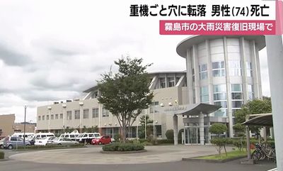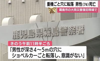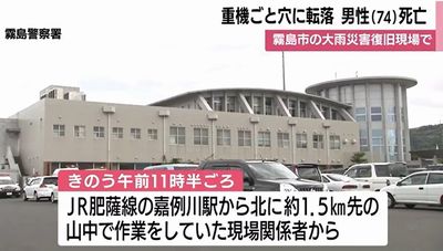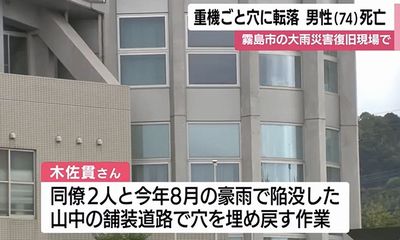 2025年8月の大雨で陥没した鹿児島県霧島市の山の中の舗装道路で、10月21日復旧作業に当たっていた74歳の作業員が重機ごと穴に転落し、死亡した。
