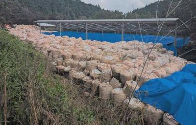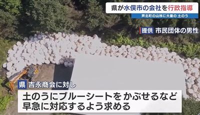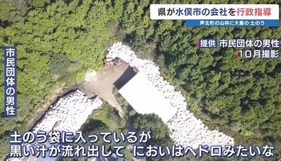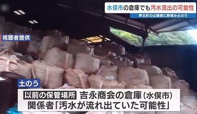 熊本県芦北町古石の山林で汚泥とみられる黒い物質が詰められた大型土のう「フレコンバッグ」(最大1トン)が大量に野積みされていて、搬入したのは水俣市の廃棄物処理業「吉永商会」で、同日現地を確認した熊本県は、付近で黒い水が流れ出ているとして吸水や土のうをシートで覆うなどの汚水対策を講じるよう同社を行政指導した。