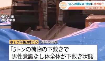 警察と消防によると、午後3時すぎ、福岡市東区箱崎ふ頭で、同僚から「男性が5トンの鋼材の下敷きになっている。35歳男性意識なし、体全体が下敷き状態」と消防に通報があった。