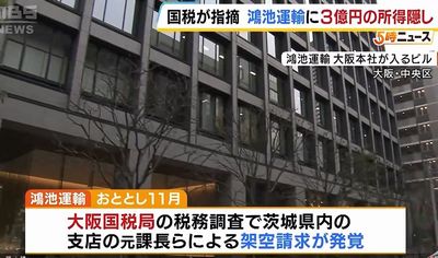 同社が24年4月に公表した社内調査結果によると、鹿島支店(茨城県鹿嶋市)の元課長らが取引先7社に架空の請求書を作成させるなどして、鴻池運輸から計約5億4900万円が支払われた。代金は下請け側に裏金としてプールされ、一部は元課長らにキックバックされ私的に使ったとみられる。国税局は、この約3億円分が所得隠しにあたると判断したという。