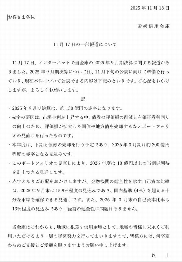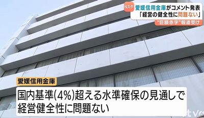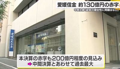 愛媛信用金庫が「巨額赤字」を計上するという一部報道を受けコメントを発表した。それによると、今年度の中間決算でおよそ130億円の赤字を計上する見通しだが「経営の健全性に問題はない」と説明している。