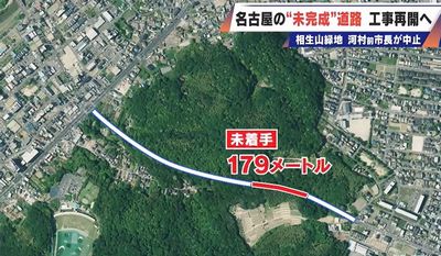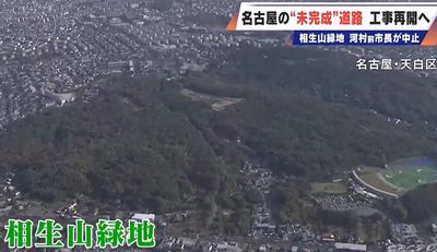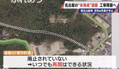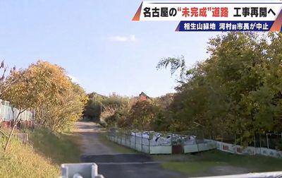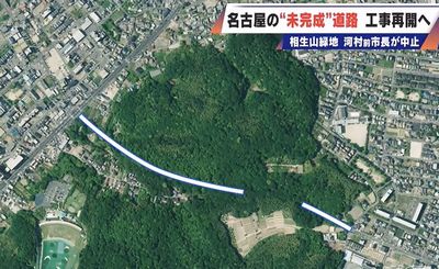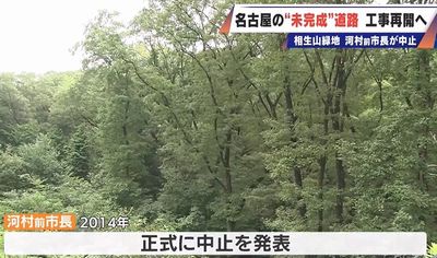 住宅街の真ん中にある相生山緑地には、1993年に道路建設が都市計画決定されました。しかし、「現地に群生するヒメボタルなど貴重な自然を守るべき」という市民団体の声が高まり、河村前市長が2010年に工事を中断。その後、学術検証委員会や市民アンケートなどを経て、2014年に正式に中止を発表した。