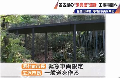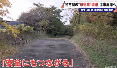 相生山緑地を突っ切るように作られ、真ん中で途切れている道路。河村たかし前市長が中止した相生山緑地の179mの“未完成道路”、この道路計画を広沢市長が「緊急車両だけでなく一般車も通れるように」復活させるというのだ。