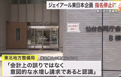 国の委託費や補助金など約20億円を不正に受給した問題を受け、東北地方整備局はジェイアール東日本企画を9カ月間の指名停止とした。