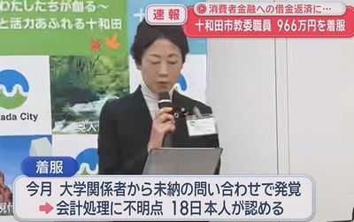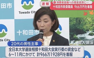 青森県の十和田市教育委員会は11月26日、市教委の20代男性主事が、スポーツ大会の資金など併せて準公金約966万円を着服したとして、同日付で懲戒免職処分にしたと発表した。