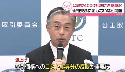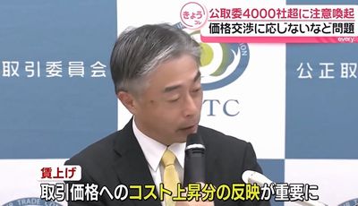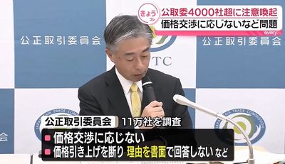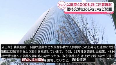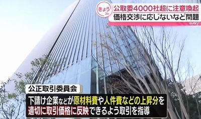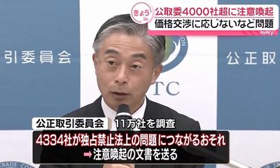 公正取引委員会は2025年12月15日、下請けなど取引先と協議しないまま取引価格を据え置く行為などが、独禁法が禁じる「優越的地位の乱用」に当たる恐れがあるとして、4,334事業者に注意喚起文書を送付したと発表した。