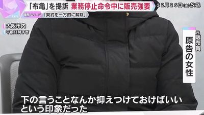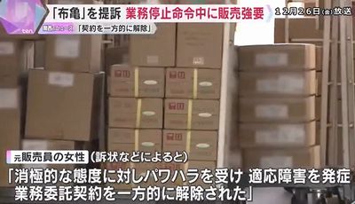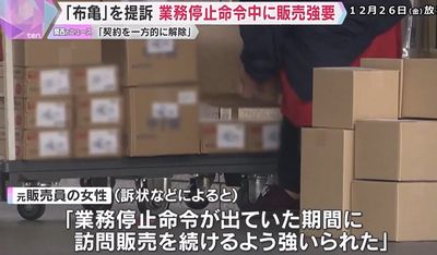 2025年12月26日、救急箱で知られる「布亀」で働いていた女性が、業務停止命令が出ていたにもかかわらず訪問販売を続けるよう強いられたとして、損害賠償を求める訴えを起こした。