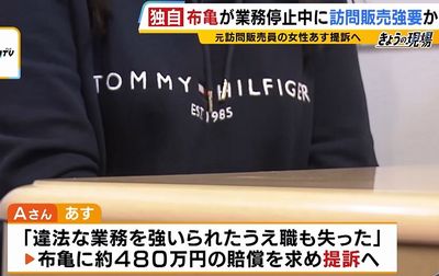 違法な訪問販売で2024年、業務停止を命じられた「布亀の救急箱」で知られる「布亀」で働いていた女性が「停止期間中も訪問販売を続けるよう強いられた」として、提訴することが分かった。