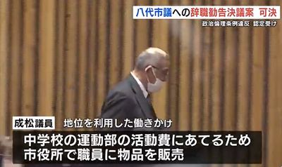 成松 市議をめぐっては、中学校運動部の活動費と称して八代市役所内で幹部職員に物品販売をさせていた行為について12月12日、市の政治倫理審査会が「条例に違反する行為があった」と結論付けている。