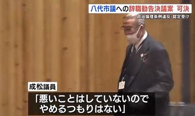 市議会は12月23日、市政治倫理審査会の報告書で条例違反とされた成松由紀夫議員への議員辞職勧告決議案も賛成多数で可決した。