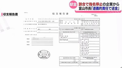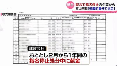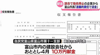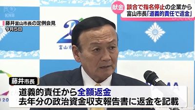 富山市の藤井市長が代表を務める自民党の支部が、2024年、談合事件に関与して市から指名停止処分を受けた会社から、10万円の献金を受け取っていたことが判明。