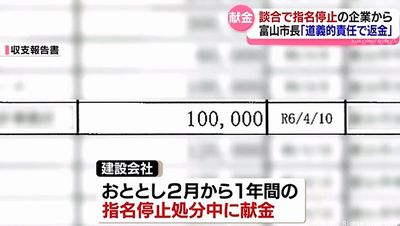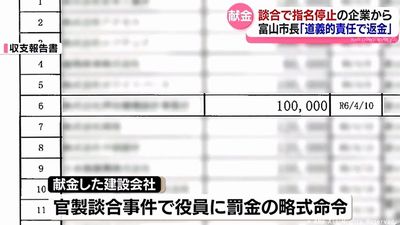この会社は県内の官製談合事件に関わったとして役員が罰金の略式命令を受け、富山市は2024年2月から1年間、市が発注する工事の入札に参加できない指名停止の処分としていた。献金を受けたのは指名停止の期間中だった。