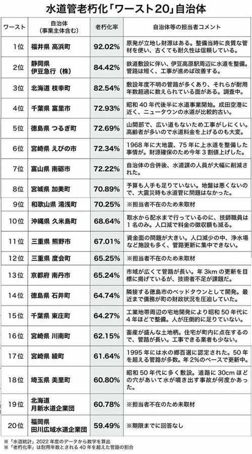 2025年6月現在、全国の水道管のうち約2割、17.6万kmが法定耐用年数の40年を超え、老朽化が深刻な社会問題となっている。多くは昭和30~40年代の高度経済成長期に整備されたものである。しかし、更新率は年間わずか約0.65%と低く、このままのペースでは全ての管路を交換するのに130年以上かかるとされている。