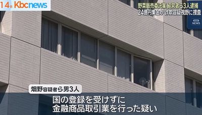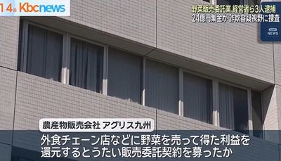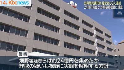 捜査関係者によると、熊本県の農産物販売会社「アグリス九州」の代表取締役、畑野博樹容疑者(52)ら男3人は、2021年12月から2022年6月に、9人に対しキャベツなど野菜の販売委託事業への出資を勧誘し、無登録で金融商品取引業を行った疑い。