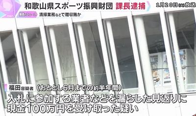 和歌山県スポーツ振興財団が発注した清掃業務などの入札を巡り、業者に便宜を図った見返りに、現金100万円の賄賂を受け取ったとして、財団の課長が逮捕された。