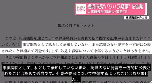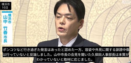 山中市長は同日、横浜市役所で報道陣の取材に応じ、他の幹部職員に対する暴言があったと指摘されたものの一部を認め、「(人事部長と2人しかいない)限定された空間とはいえ、行き過ぎた表現があったことについては真摯に受け止めなければならない」などと話した。
