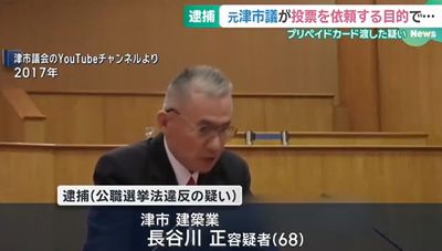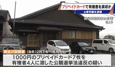 逮捕されたのは、元津市議で建設業の長谷川正容疑者(68)は、市議選告示前の2025年12月から2026年1月にかけて、有権者4人に1000円分のプリペイドカードあわせて7枚を配り、投票を依頼した買収と事前運動の疑いが持たれている。