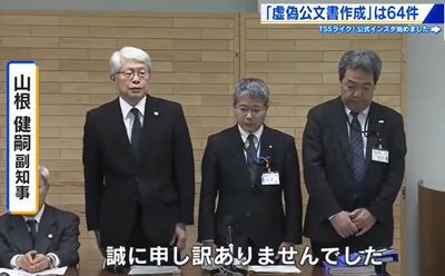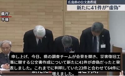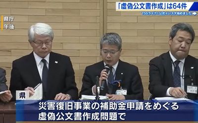 県の災害復旧工事に関する公文書作成を巡っては、64件が虚偽だったことが判明し、また、虚偽の公文書を国に提出し、補助金の増額を受けていた。