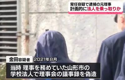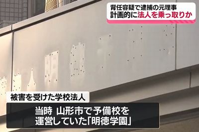 理事を務める学校法人の土地や校舎を担保に約4200万円を負担させ損害を与えたなどとして、山形県警は3月7日、背任と有印私文書偽造・同行使の疑いで、元理事、金田充史容疑者(54)を逮捕したと発表。捜査関係者によると、学校法人は山形市の「明徳学園」。逮捕は6日。