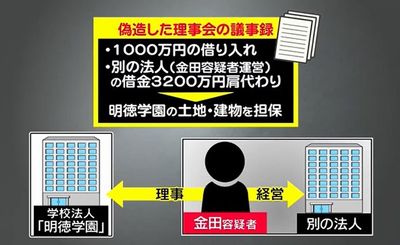 偽造された議事録では、コンサルティング会社から約1000万円の借り入れのほか金田容疑者が運営する別の法人の借金を肩代わりさせるために「明徳学園」が所有する不動産に抵当権を設定することなどが承認されていた。借り入れと借金の総額はおよそ4200万円。返済が滞ったことにより不動産は競売にかけられ第3者が所有。